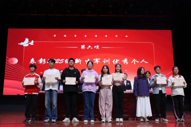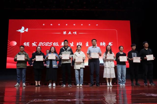 典礼上,学院为新聘任的2025级新生班主任颁发聘书,表彰了军训中表现优异的个人。在领誓人王丽的带领下,全体新生庄严宣读《医学生誓词》,铿锵誓言回荡会堂:“我志愿献身医学,为祖国医药卫生事业发展和人类身心健康奋斗终身!”
