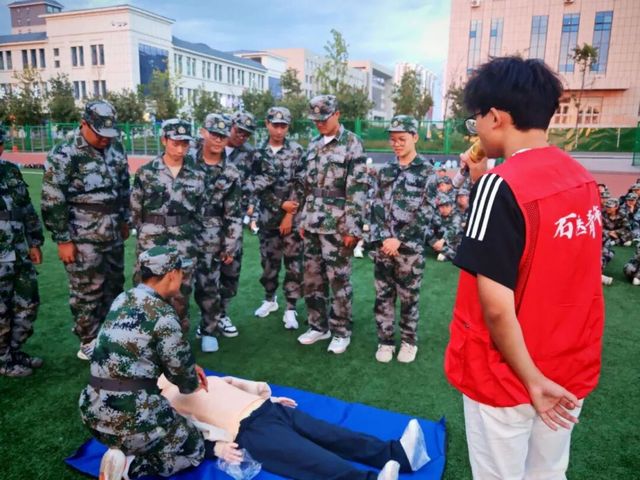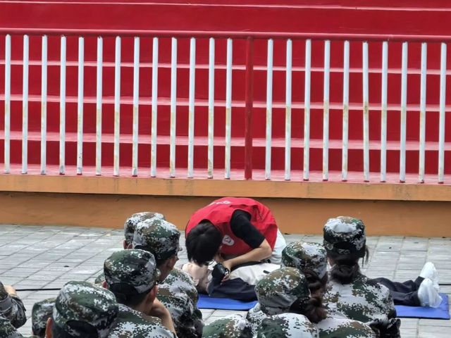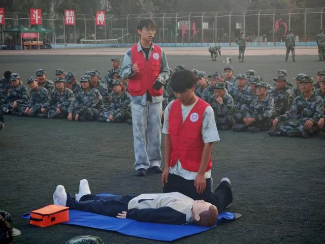 “要是身边有人突然倒地,大家第一反应该做什么?” 培训现场,主讲人王嘉鑫抛出问题。迷彩队列里立刻响起此起彼伏的回答,有人说 “喊他”,有人急着 “打电话”,青春的声音里满是求知的热切。随后,在志愿者的默契配合下,培训以 “理论 + 实操” 的形式层层展开:从校园意外、创伤等真实案例切入,拆解心肺复苏的每一步,生动的讲解配上直观的操作,让原本抽象的急救知识,变成了新生眼前 “看得见、学得会” 的实用技能,“人人会急救、急救为人人” 的理念也跟着钻进心里。