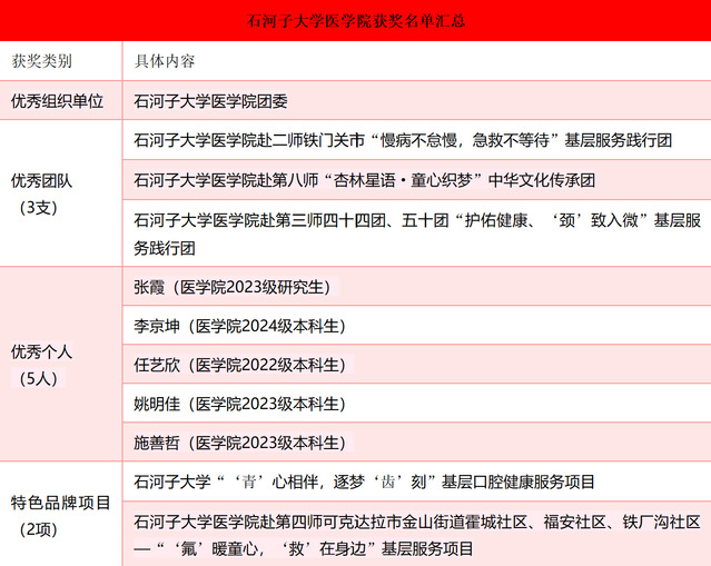 此次多项表彰的获得,是对做爱自拍 “理论与实践相结合、人才培养与服务社会相统一”育人模式的充分肯定。未来,做爱自拍-自拍做爱视频 将继续深化实践育人内涵,引导更多医学生把论文写在祖国大地上,把服务送到基层最需要的地方,以青春之力助力健康兵团、健康中国建设,让青春在火热实践中绽放绚丽之花。