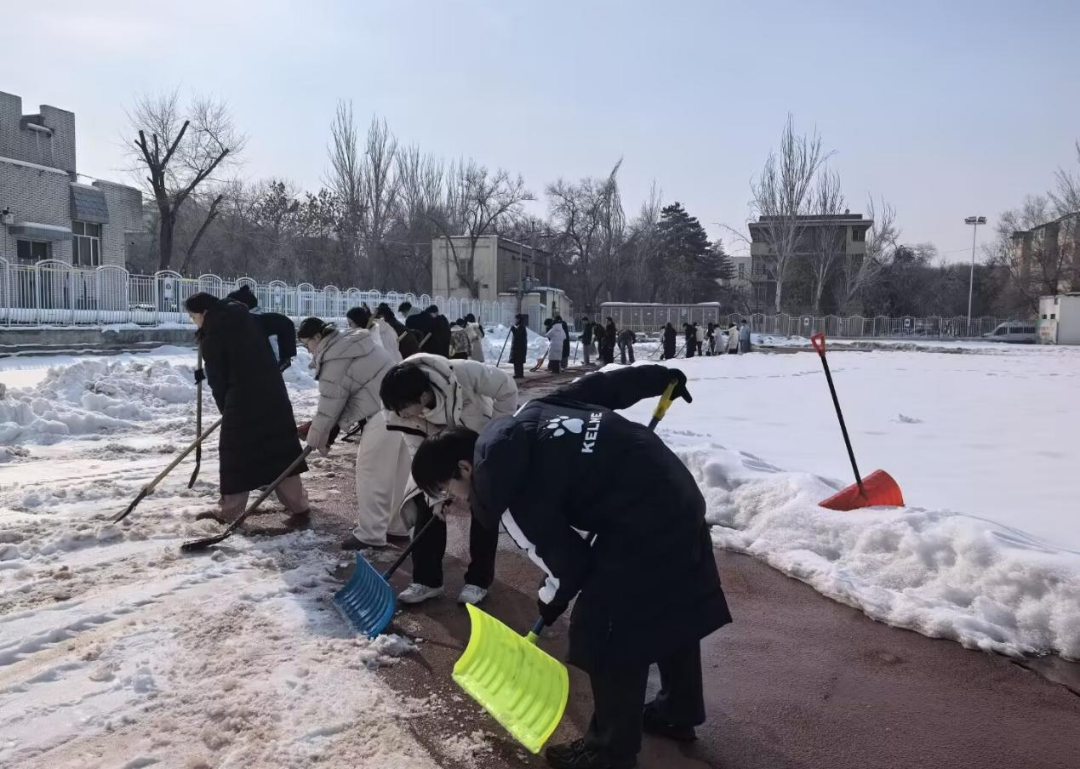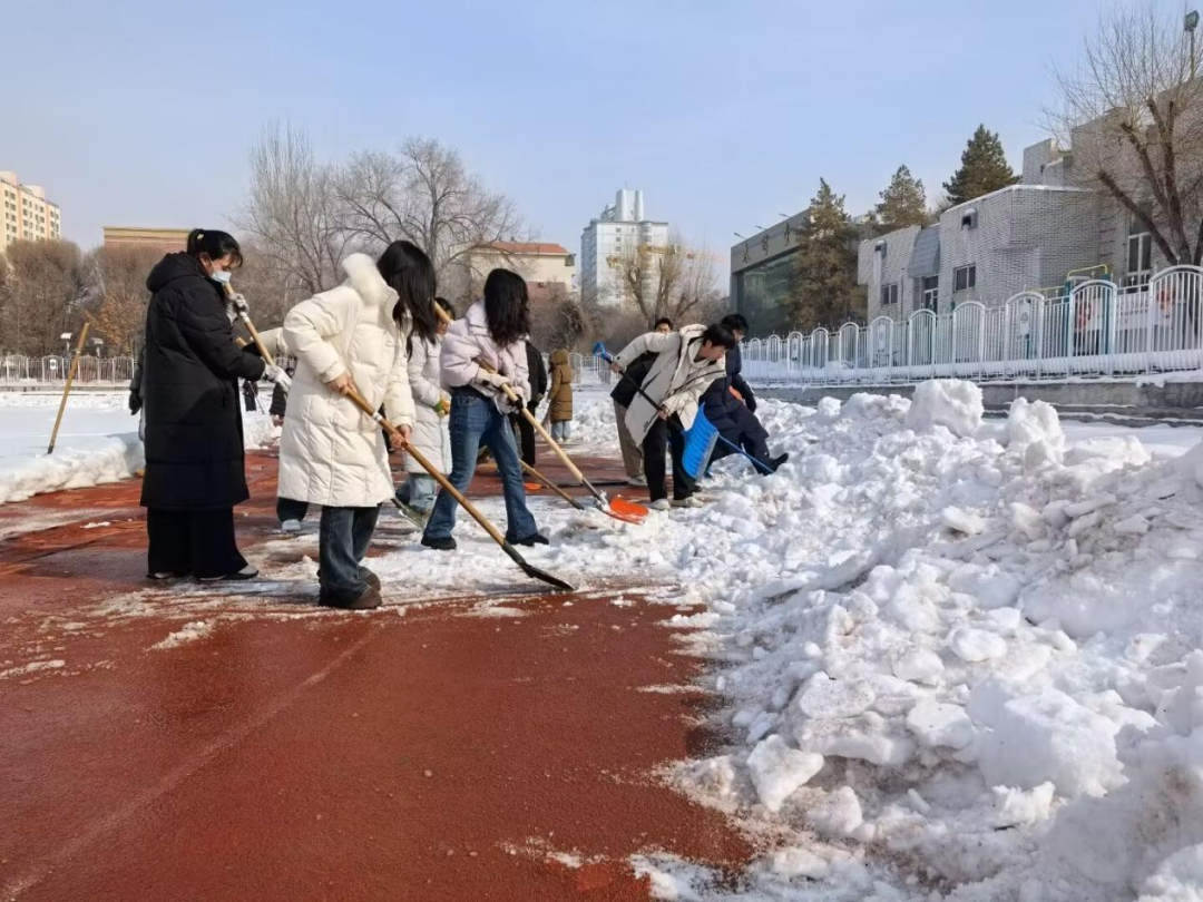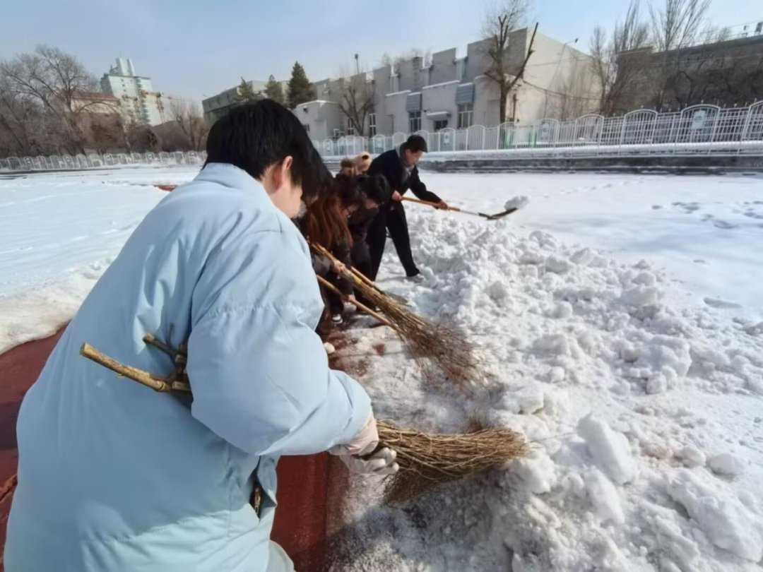 部分志愿者手持扫帚,对操场地面的浮雪进行细致清扫。大家沿着统一方向稳步推进,将散落的积雪集中归拢,方便后续清运,进一步提升了场地整洁度。
