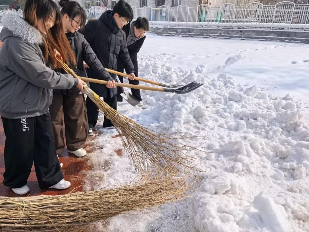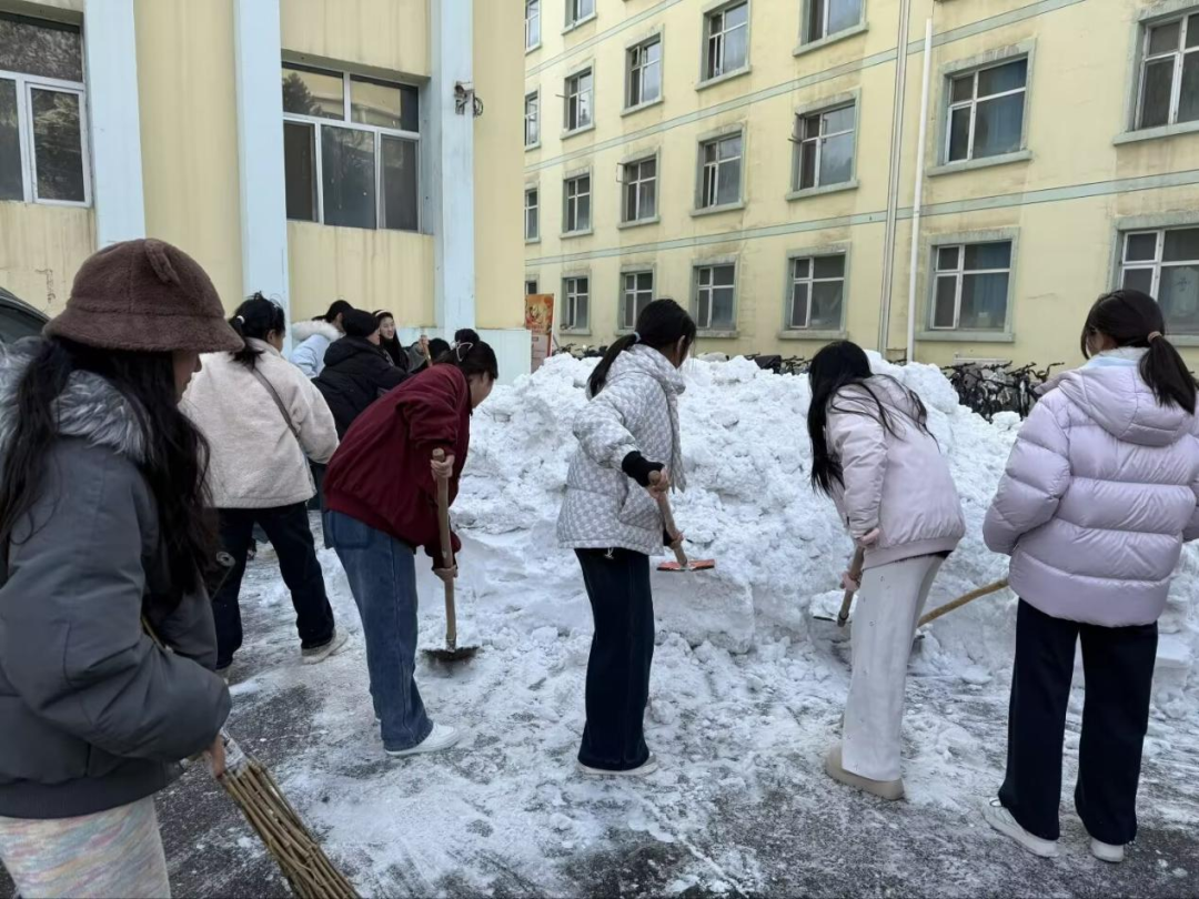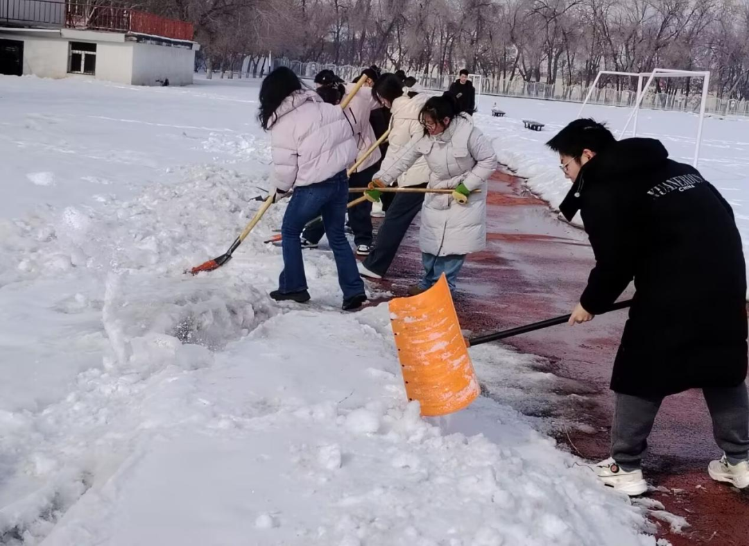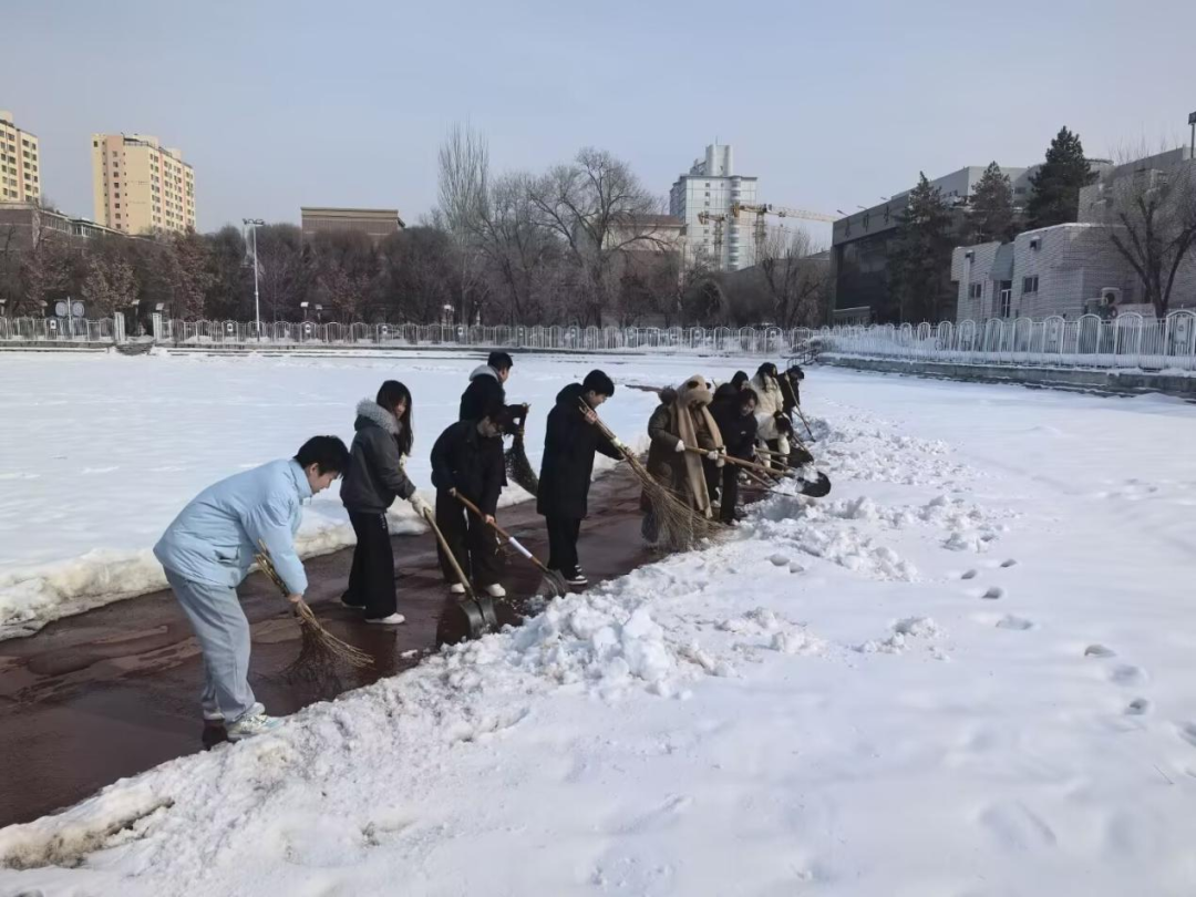 活动当天,志愿者们准时集结,在工作人员统一安排下迅速分工、有序行动。大家不畏严寒、热情高涨,手持铁锹、扫帚、推雪板等工具奔赴各自区域,充分展现了青年学子积极向上、乐于奉献的精神风貌。