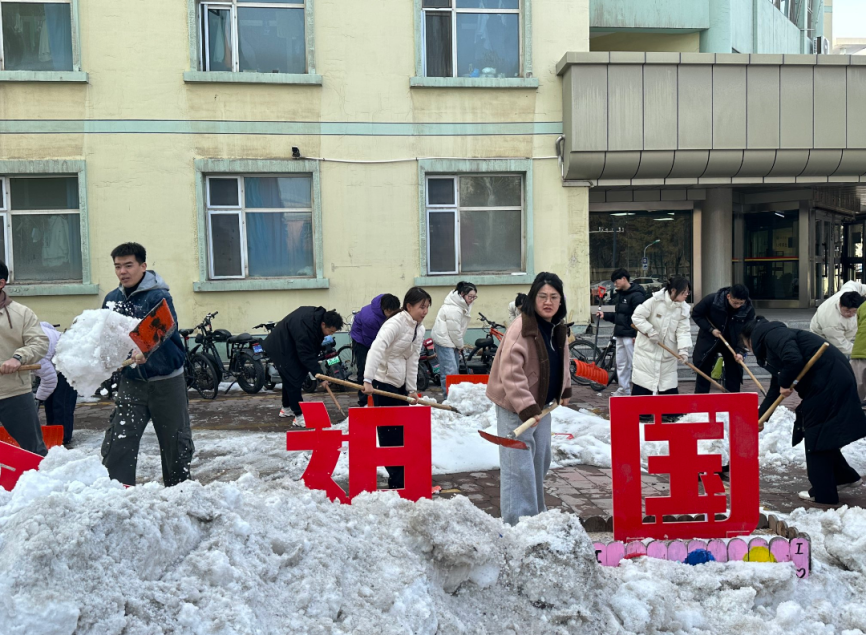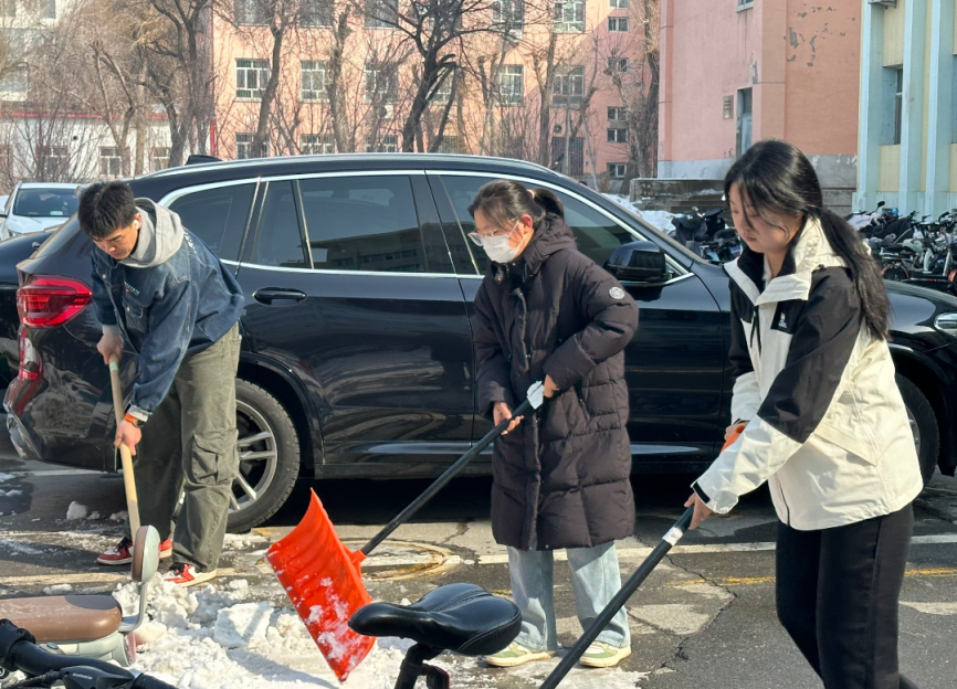 活动现场,党员同志们热情高涨、分工协作,迅速投入到志愿服务中。大家手持扫雪铲、铁锹等工具,认真清理路面残雪,铲除结冰路段,全力消除师生出行安全隐患,确保校园道路安全畅通。针对非机动车停放杂乱问题,党员们耐心将乱停乱放的自行车、电动车逐一搬移、规范摆放,引导车辆有序归位,让停车区域整齐划一、通行顺畅。寒风中,党员同志们不畏低温、干劲十足,用汗水清扫出洁净安全的校园环境,用行动擦亮党员身份。