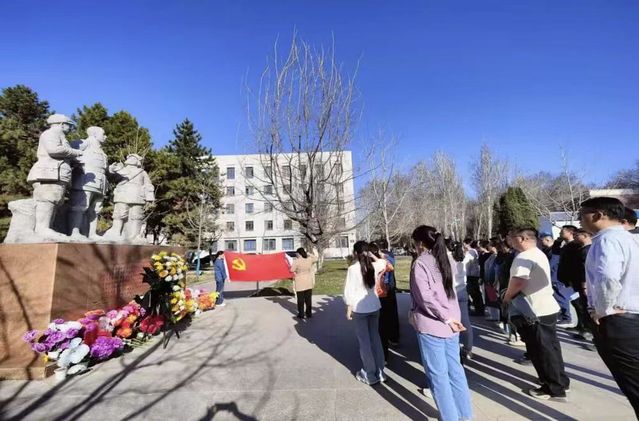 活动现场庄严肃穆,王震将军雕像巍然矗立,生动镌刻着老一辈军垦战士屯垦戍边、建设边疆的峥嵘岁月,承载着全体教师对革命先辈的深切崇高敬意与深切追思。老师们列队肃立,以庄重仪式缅怀先烈、寄托哀思。
